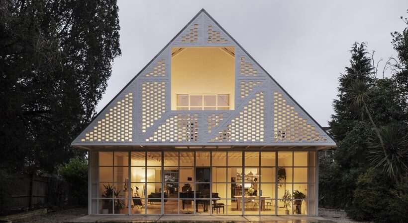 The 2-storey house located on a suburban street in Surbiton, Surrey, has mostly a simple design with a white building and a porous frontside. It has a contemporary minimalist style with an industrial feel. The design of the main feature of the house, the brick wall, resembles lacework and just mildly blurs the distinction between the interior and exterior. This attribute provides the house with a good amount of light and ventilation as well.
